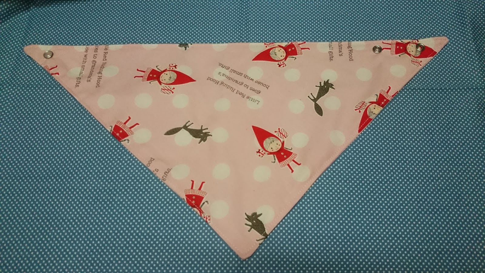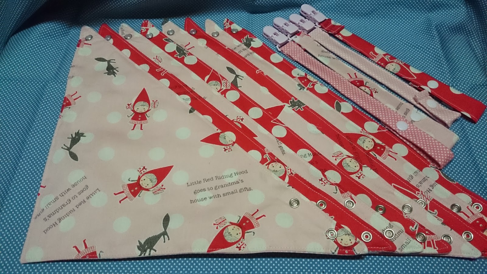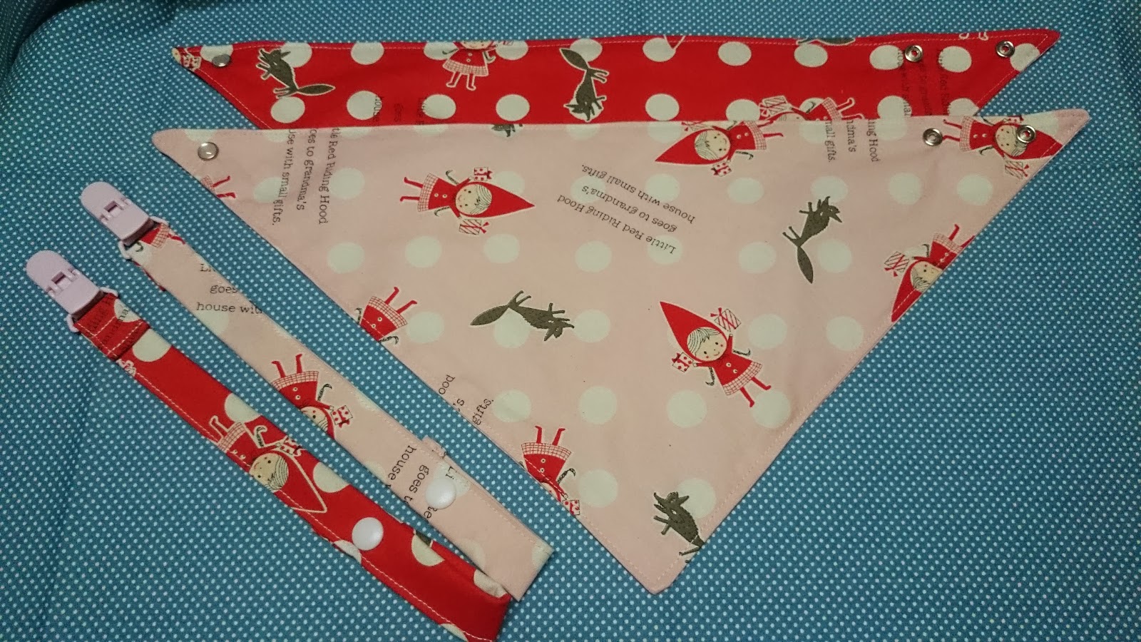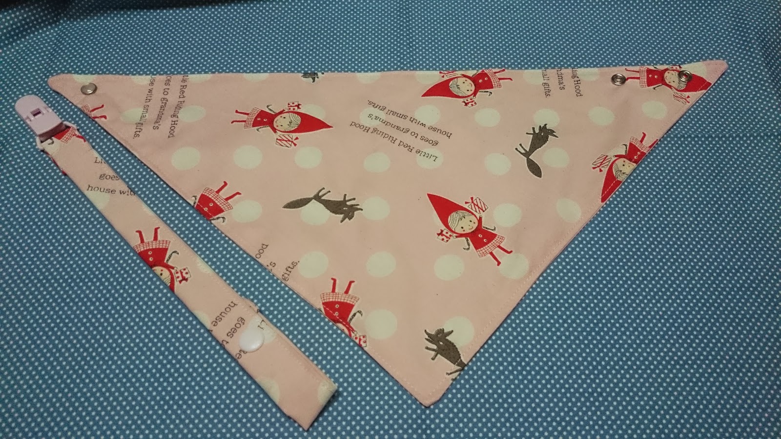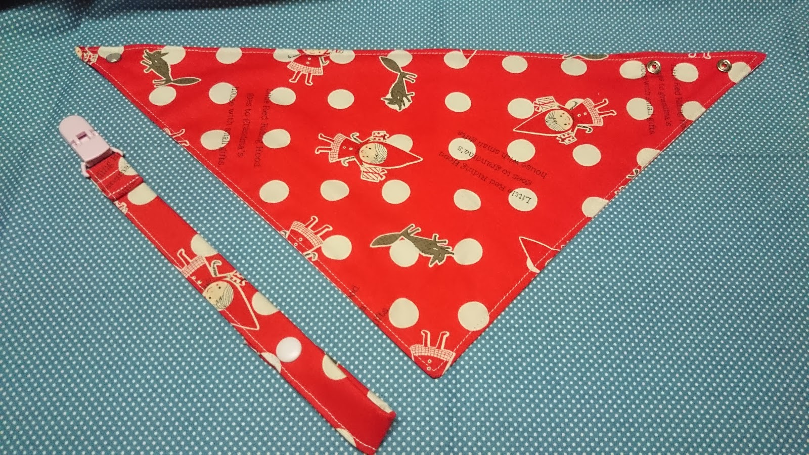 有次車了兜給保母的孫女 結果可愛的順寶寶挺有肉的 兜兜就顯的脖子太緊了~ 所以改車了三角款給她 剩的布我用來車奶嘴帶 車的不太好 有點太長~ 再次修改 棉布表底都是大同布行買的 奶嘴扣和塑脂四合扣都是小波媽那買的 車線台灣金虎標車線
